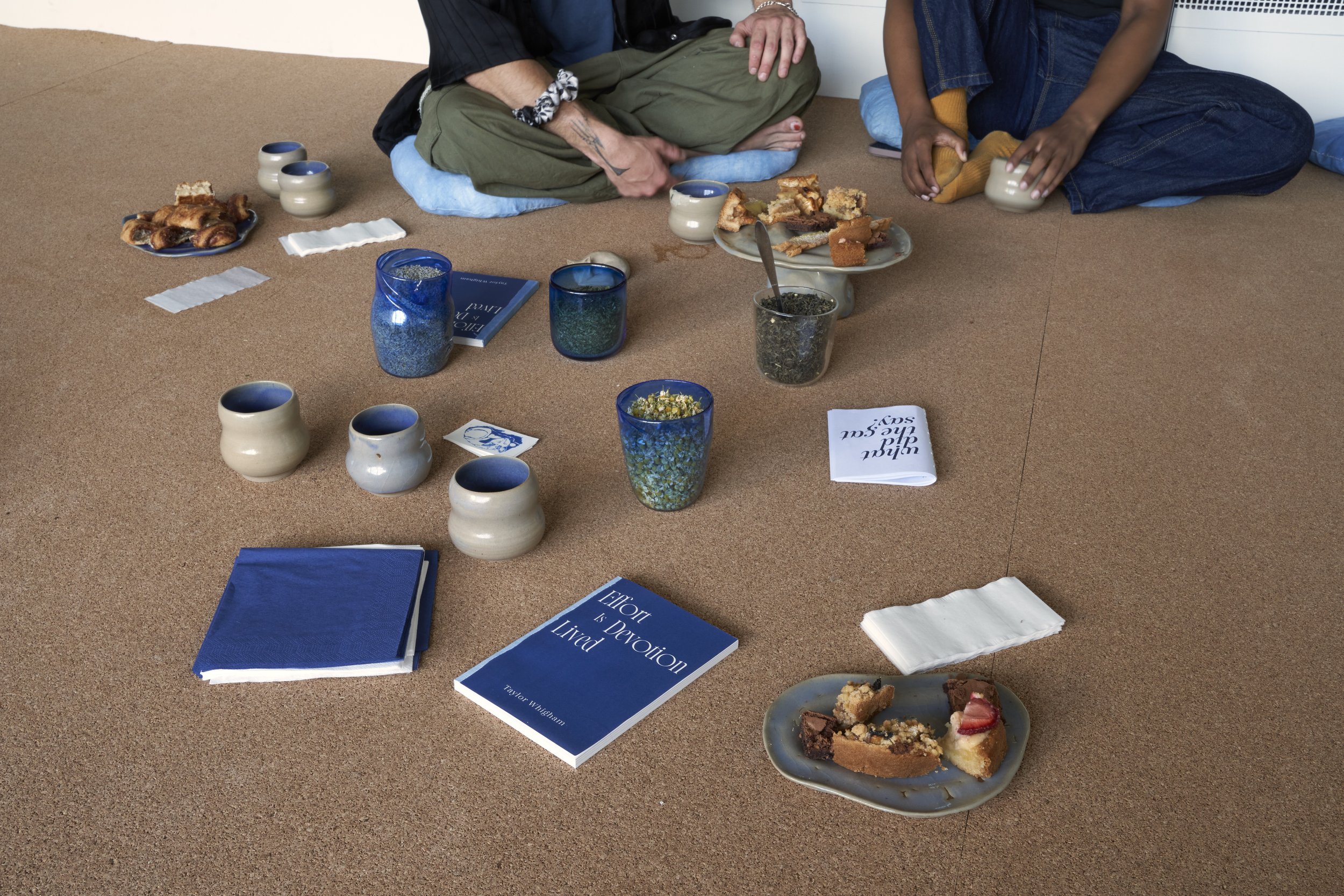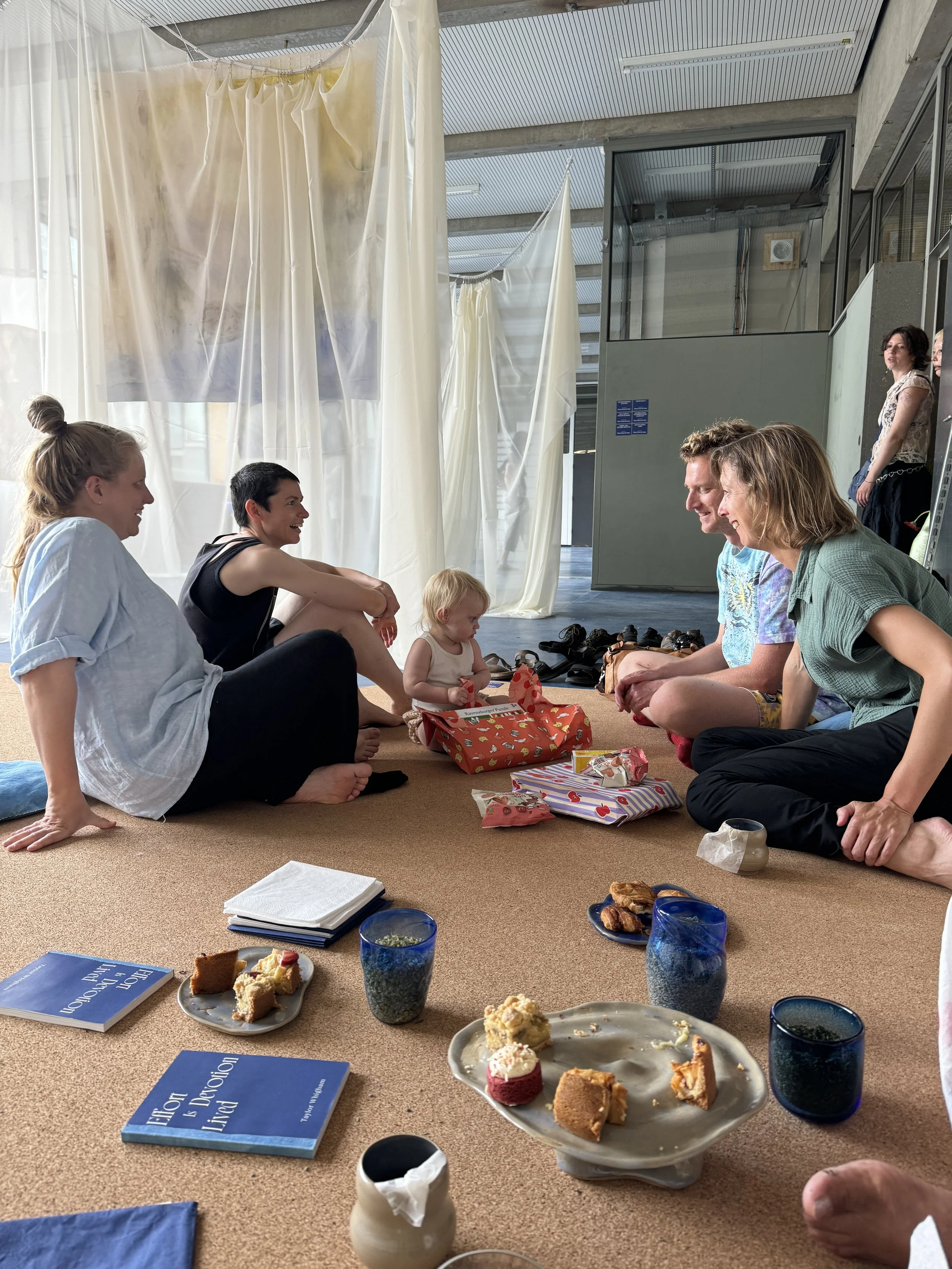 Craft, making, and diligent effort are essential elements in the creation of this environment. I have found months of physical, mental, and spiritual solace in the process of tending to each element, embracing the time and effort that each material needs to come into the space harmoniously. Now, we are all welcome to enjoy the fruits of this by getting comfortable with cushions and tea, enjoying the leisurely company of others, and reflecting on how we have come to meet at this particular time and place. What does it mean that each of our choices have led us to this ceremonial here and now?