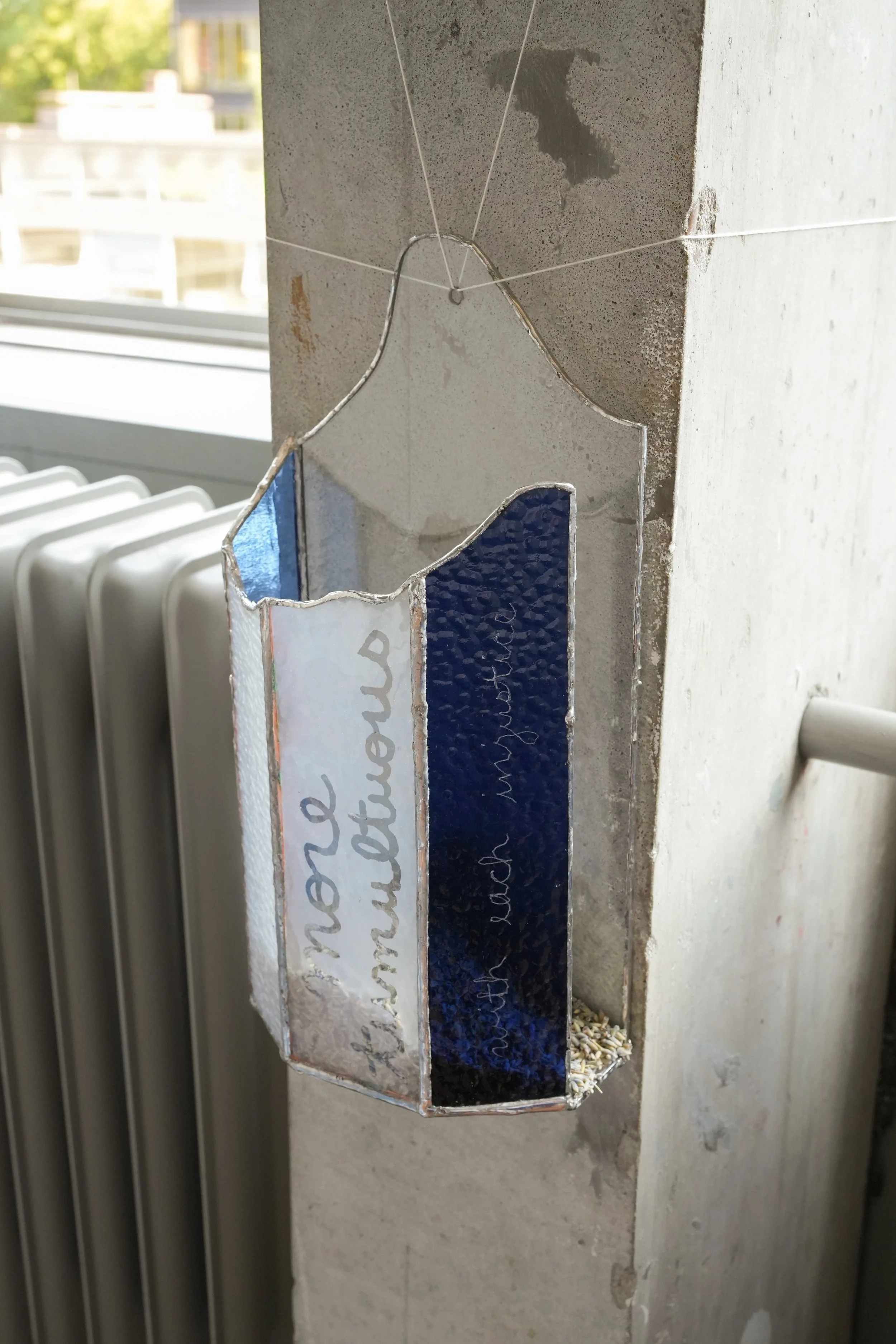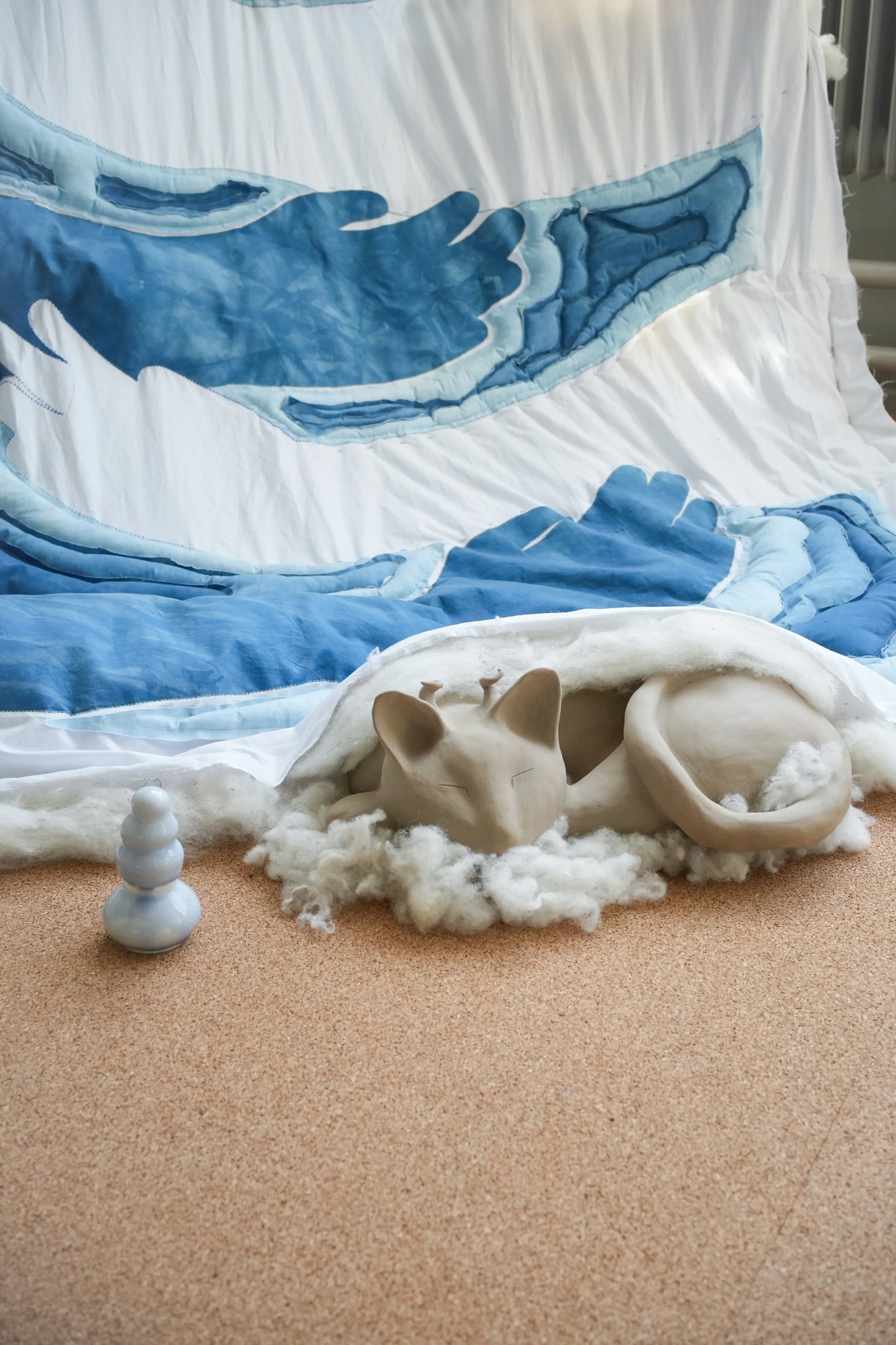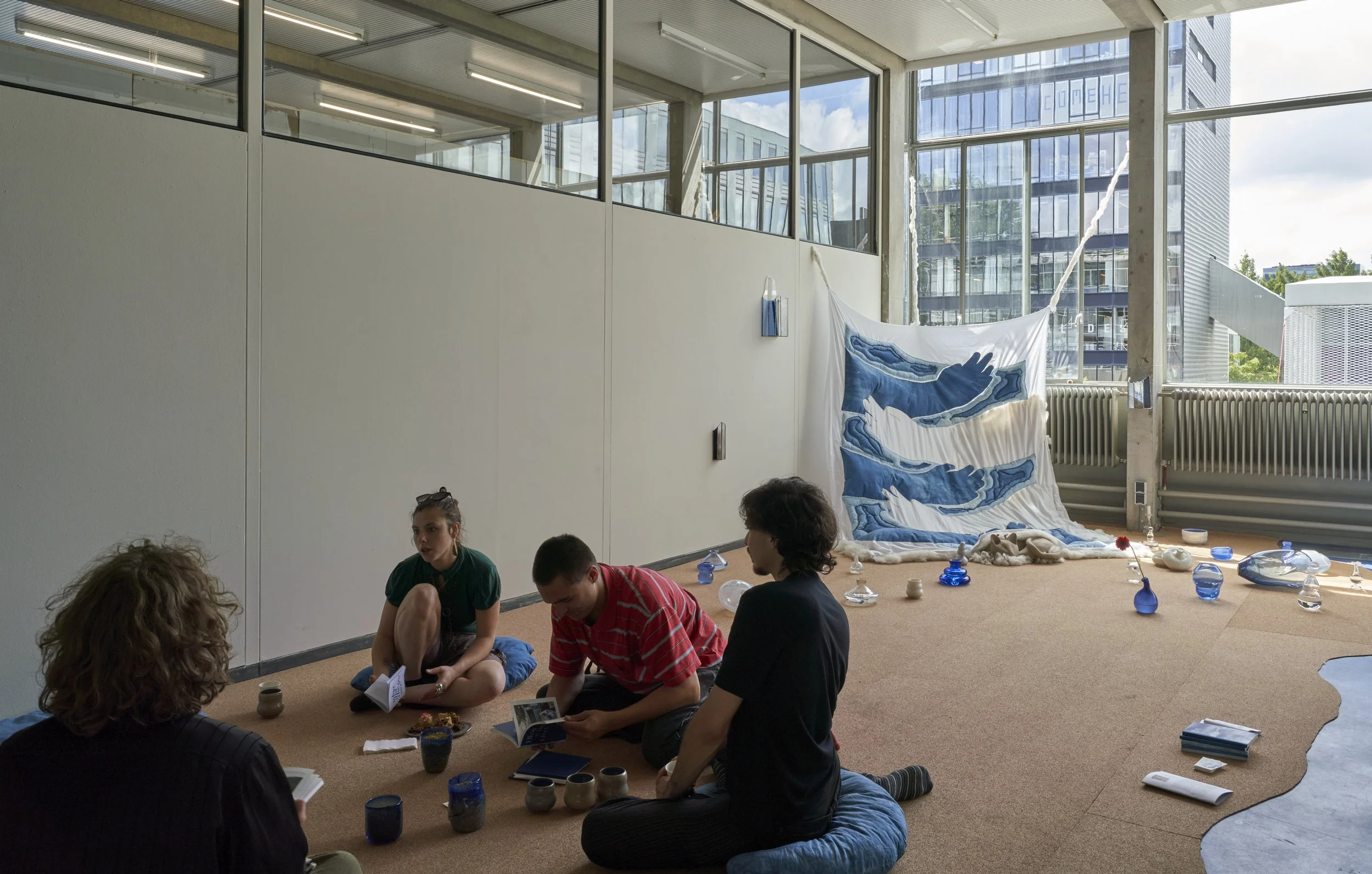 water, recycled cotton bedsheets, indigo dye, cotton thread, raw local wool, porcelain, raw stoneware, glazed stoneware, handblown glass, float glass, solder, cork, wax, yarn, recorded audio