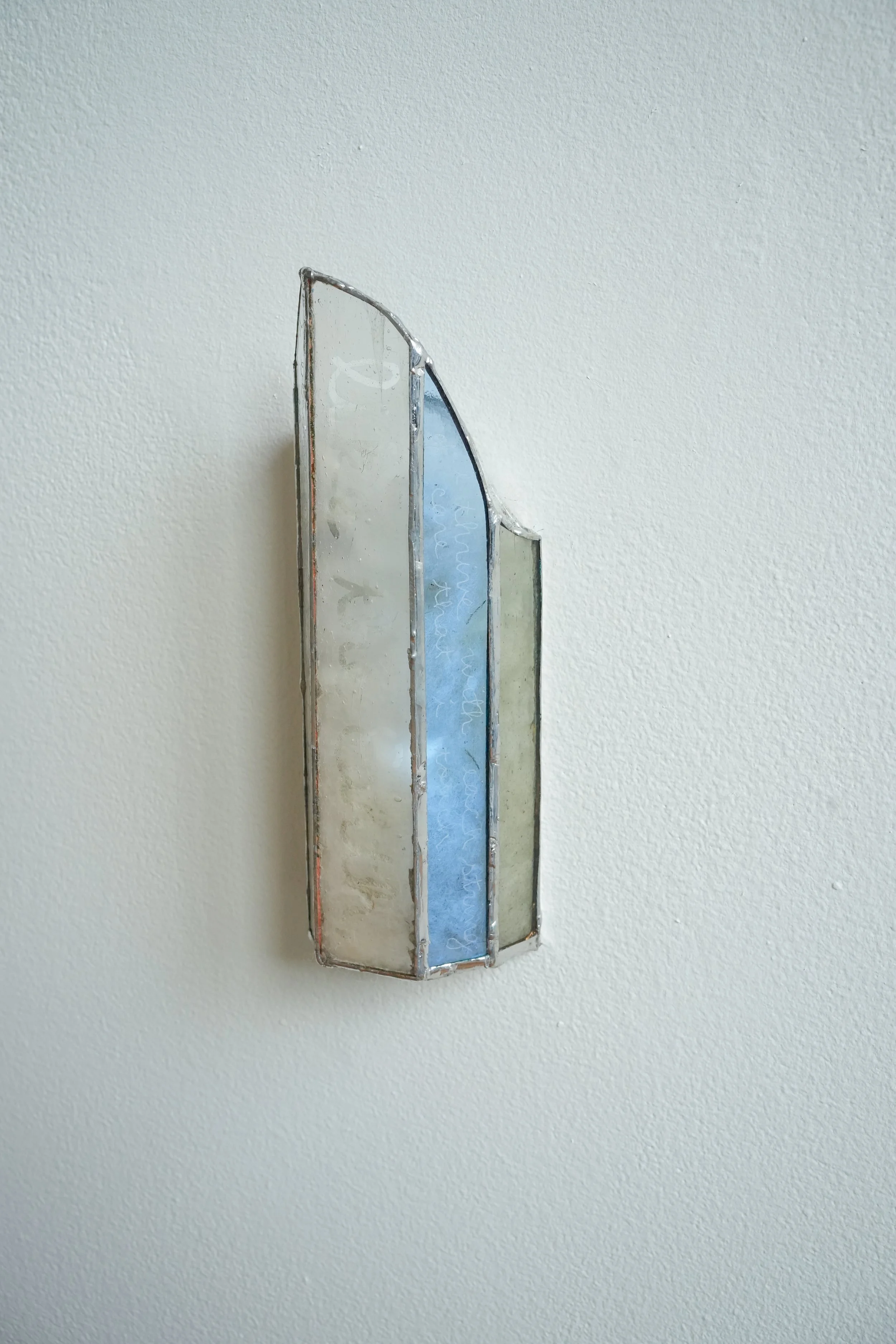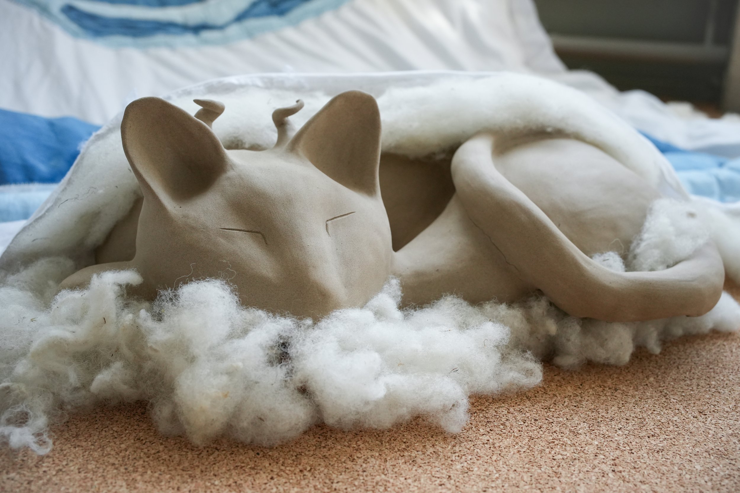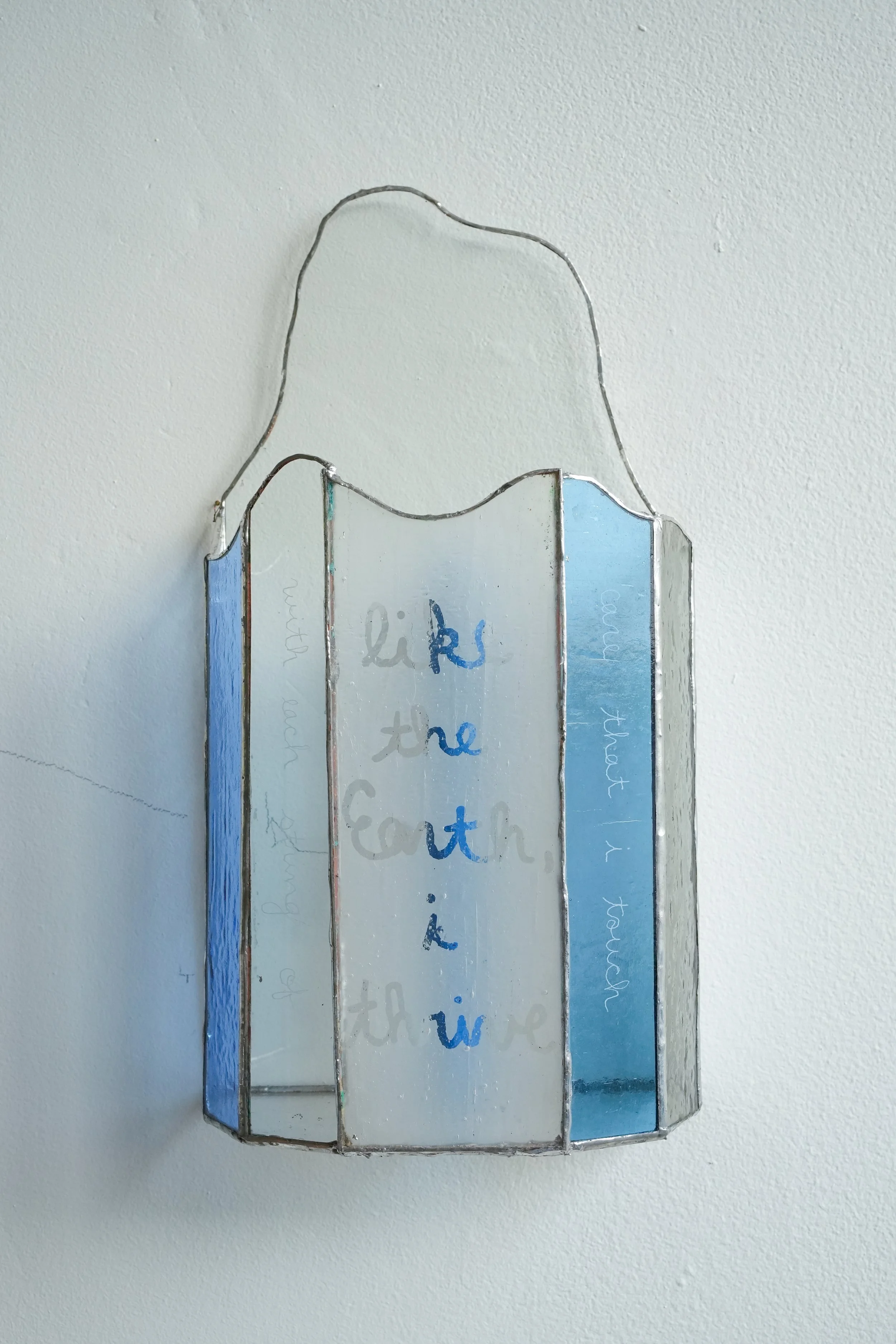 water, recycled cotton bedsheets, indigo dye, cotton thread, raw local wool, porcelain, raw stoneware, glazed stoneware, handblown glass, float glass, solder, cork, wax, yarn, recorded audio